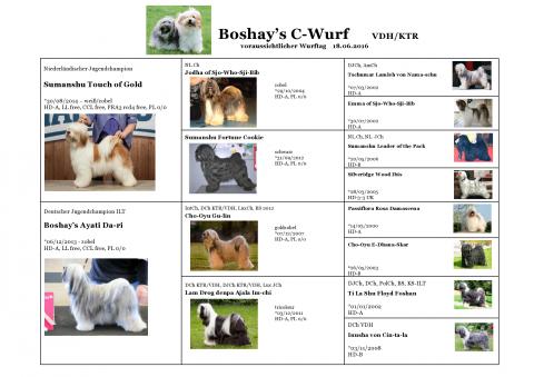 Tibet Terrier Wurfdatum: 17.06.2016 Rüden (Gesamt): 2 Rüden (Verfügbar): 0 Hündinnen (Gesamt): 4 Hündinnen (Verfügbar): 0 Eltern: Sumanshu Touch of Gold (Rüde) Boshay's Ayati Da-ri (Hündin) Kontakt: Claudia Festing-Luzay